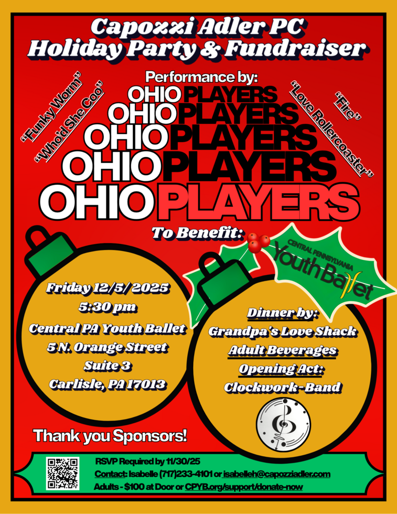 Join Capozzi Adler PC December 5th, 2025! Posted on October 22, 2025October 22, 2025 by admin Holiday Party and Fundraiser to benefit Central Pennsylvania Youth Ballet.OHIO PLAYERS will be performing, Food galore, Adult Beverages all for a Tax Deductible Donation of $100.
